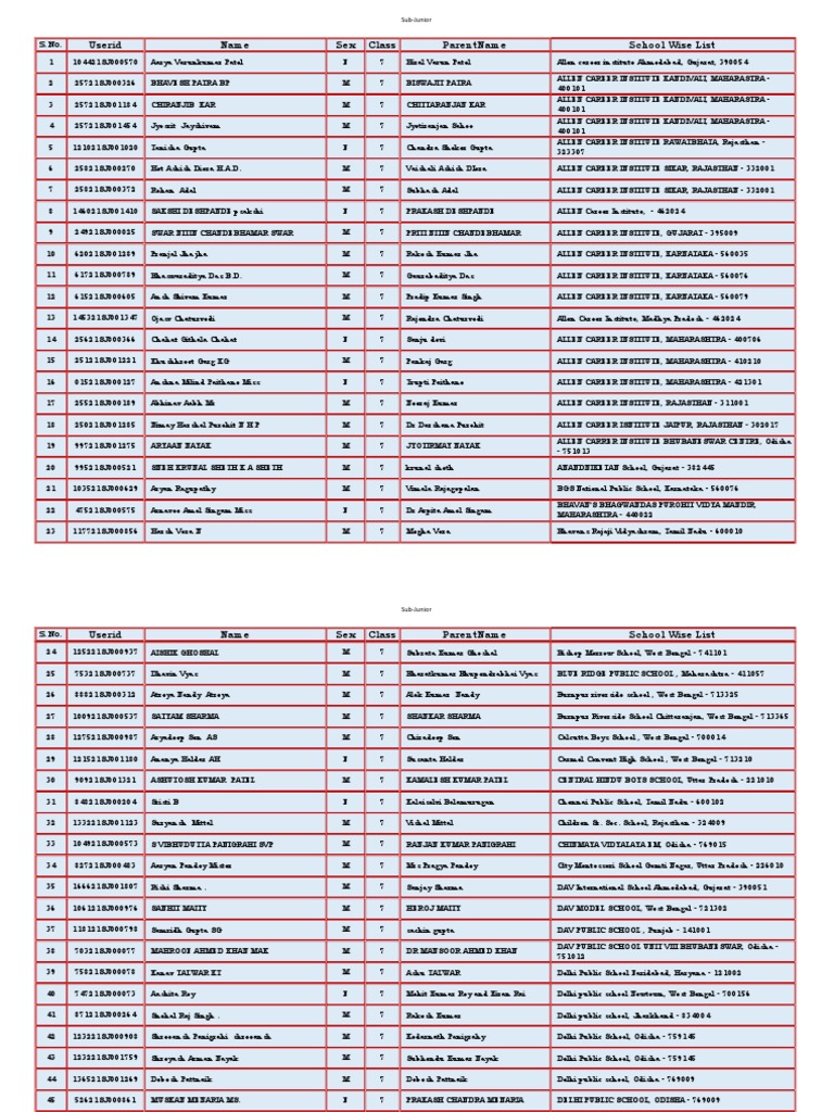 Userid Name Sex Class Parentname School Wise List: Sub-Junior