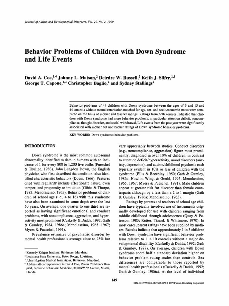 Society, the Chesapeake (Maryland) Down Syndrome atric disorder in school age children. Journal of Child Psychol-