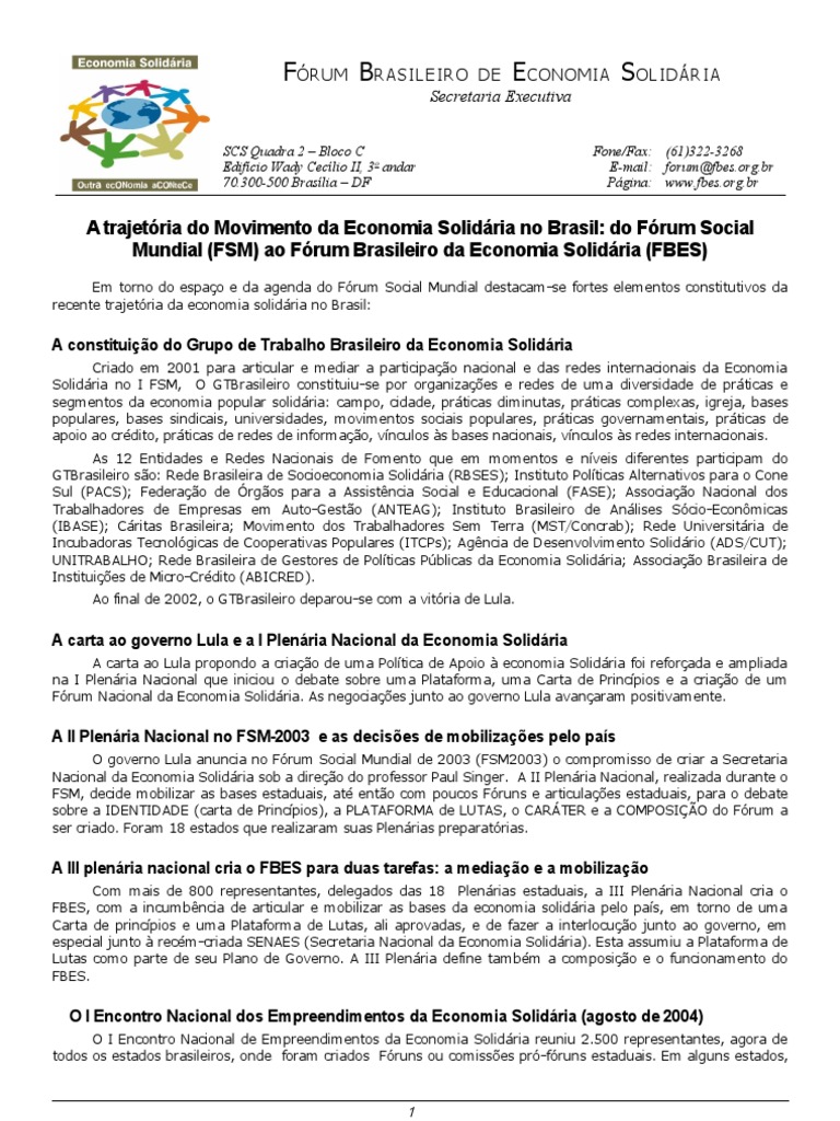 Em junho de 2003, a III Plenária Nacional da Economia Solidária, após debates em 18 estados brasileiros,