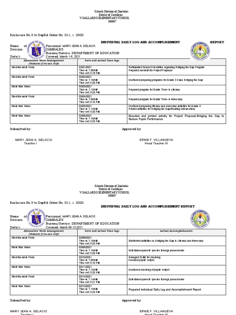 Time-in: 7:25AM Prepared Individual Daily Log and Accomplishment Report