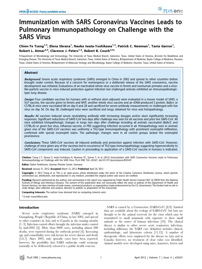 Tseng C-T, Sbrana E, Iwata-Yoshikawa N, Newman PC, Garron T, et al. (2012) Immunization with SARS Coronavirus Vaccines Leads to PulmonaryImmunopathology on Challenge with the SARS Virus. PLoS ONE 7(4): e35421. doi:10.1371/journal.pone.0035421