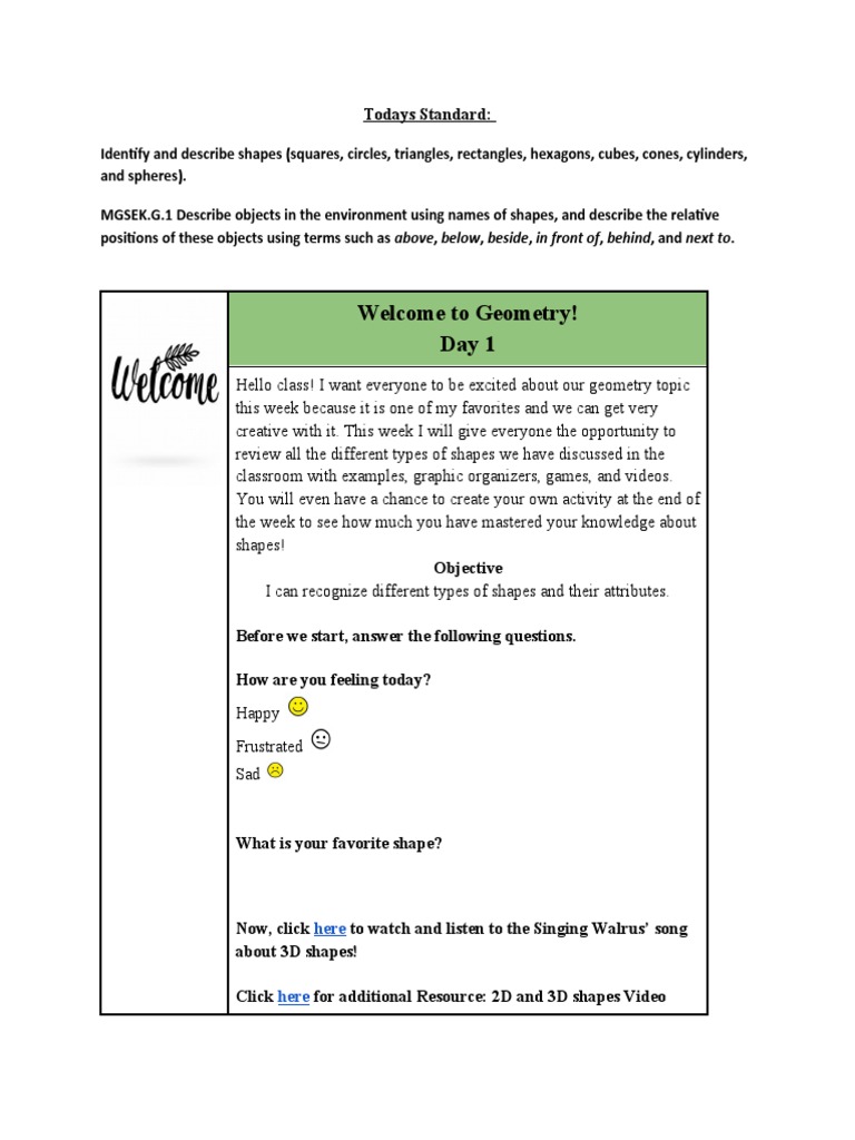 MGSEK.G.1 Describe objects in the environment using names of shapes, and describe the relative