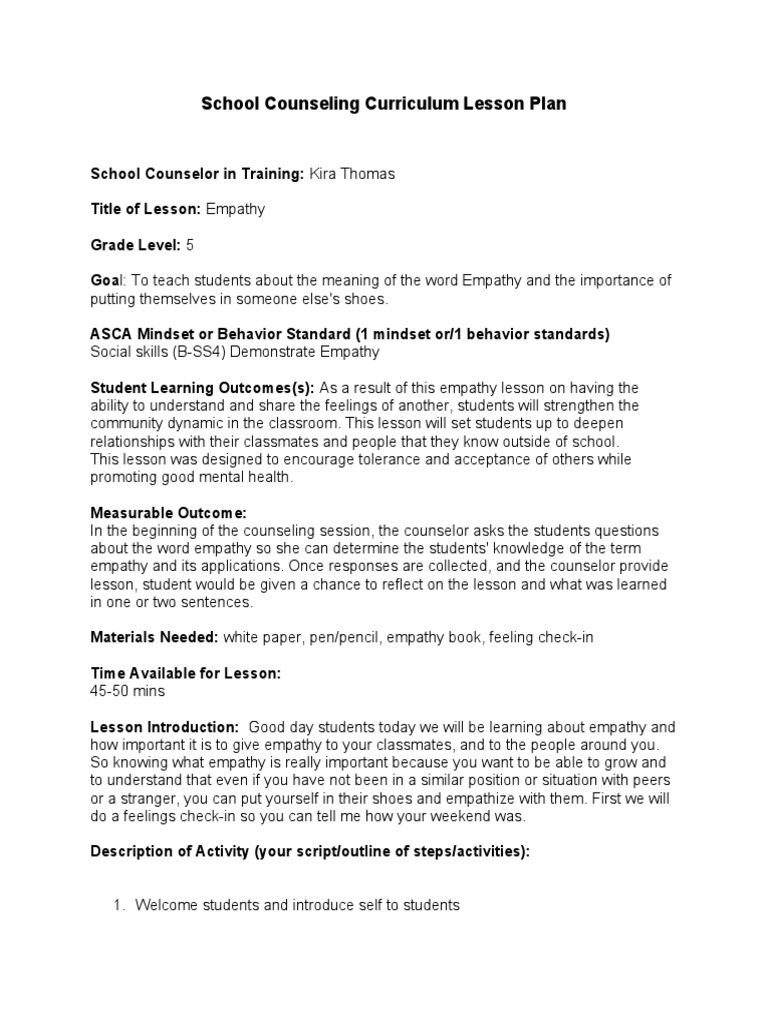 of the lesson (we will discuss empathy, how to use it, it’s benefits, read a book