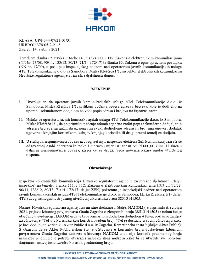 HAKOM je objavio rješenje o telefonskom broju koji je koristila tvrtka Akter Public za provođenje telefonske ankete, zbog koje je Vesna Škare Ožbolt podigla kaznene prijave.