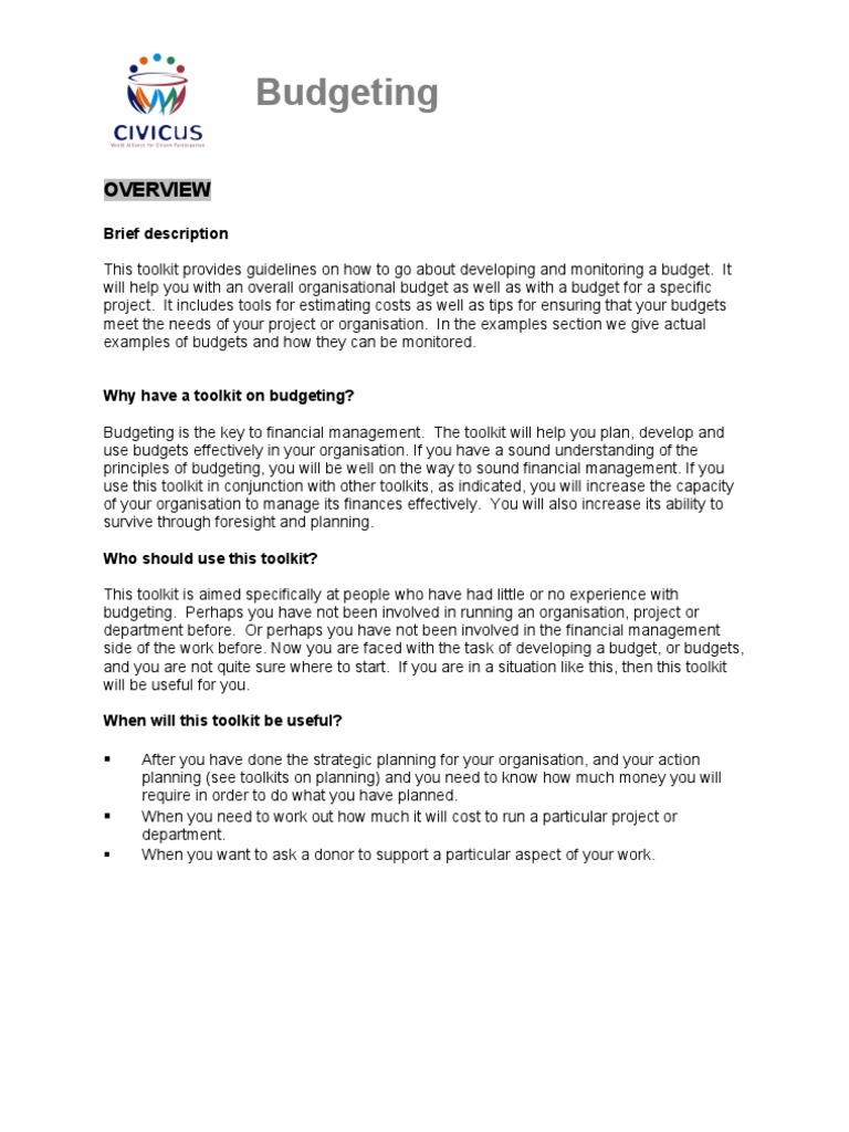This toolkit provides guidelines on how to go about developing and monitoring a budget. It