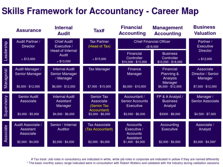# Tax track: Job roles in consultancy are indicated in white, while job roles in corporate are indicated in yellow if they are named differently