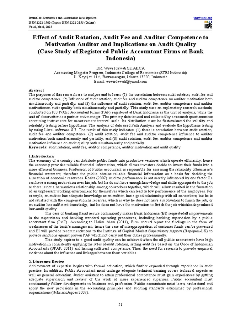 Keywords: audit rotation, audit fee, auditor competence, auditor motivation and audit quality.