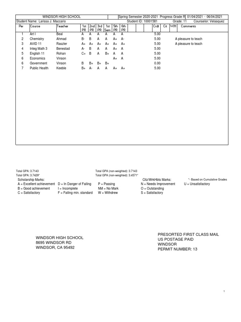 Student Name: Larissa J. Maccario Student ID: 10001581 Grade: 11 Counselor: Velasquez
