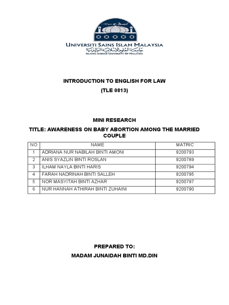 The purpose of this study is to find out Tamhidi students’ awareness on baby abortion