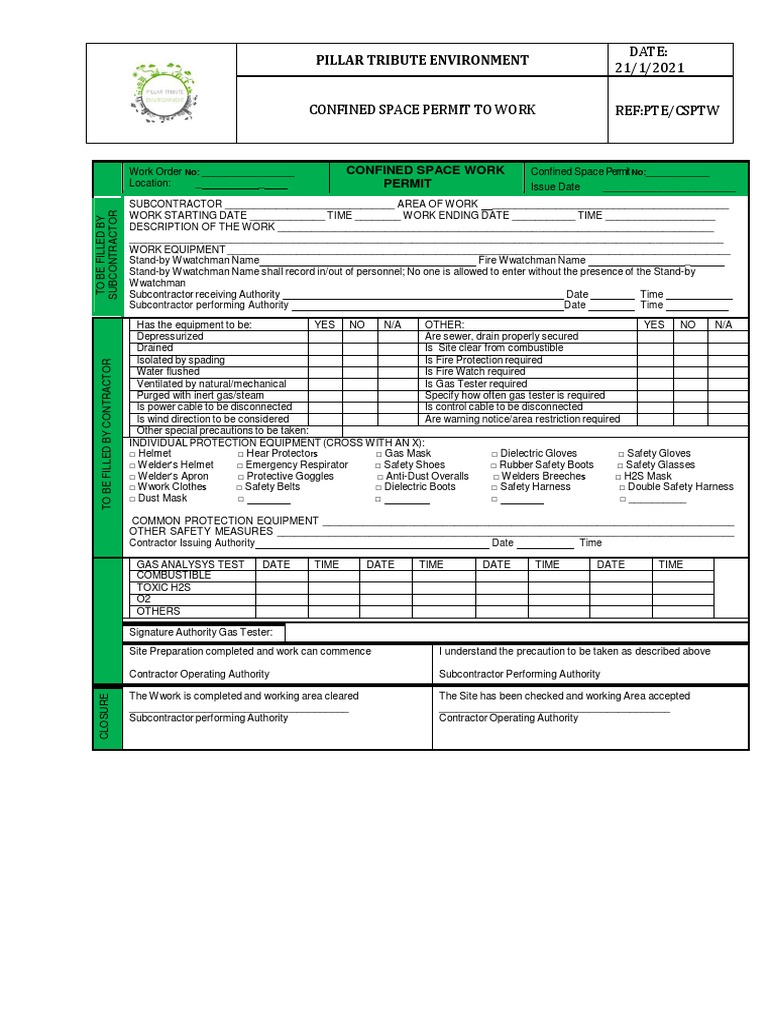 CONFINED SPACE PERMIT TO WORK REF:PTE/CSPTW