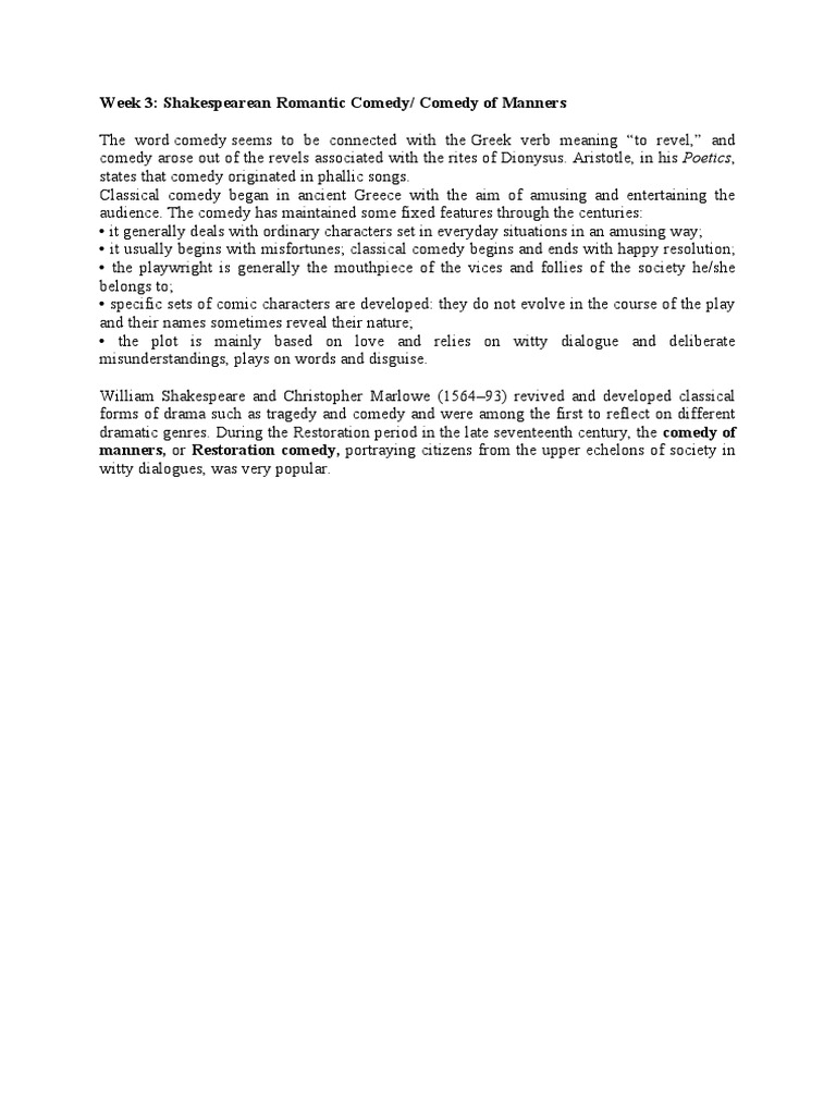 Week 3: Shakespearean Romantic Comedy/ Comedy of Manners