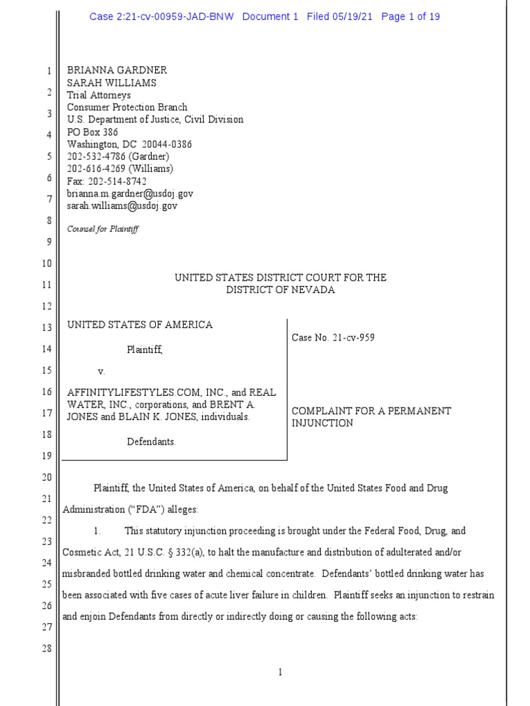 UNITED STATES DISTRICT COURT FOR THE DISTRICT OF NEVADA UNITED STATES OF AMERICA Plaintiff, v. AFFINITYLIFESTYLES.COM, INC., and REAL WATER, INC., corporations, and BRENT A. JONES and BLAIN K. JONES, individuals. Defendants. Case No. 21-cv-959 COMPLAINT FOR A PERMANENT INJUNCTION Plaintiff, the United States of America, on behalf of the United States Food and Drug Administration (“FDA”) alleges: 1. This statutory injunction proceeding is brought under the Federal Food, Drug, and Cosmetic Act, 21 U.S.C. § 332(a), to halt the manufacture and distribution of adulterated and/or misbranded bottled drinking water and chemical concentrate. Defendants’ bottled drinking water has been associated with five cases of acute liver failure in children. Plaintiff seeks an injunction to restrain and enjoin Defendants from directly or indirectly doing or causing the following acts: