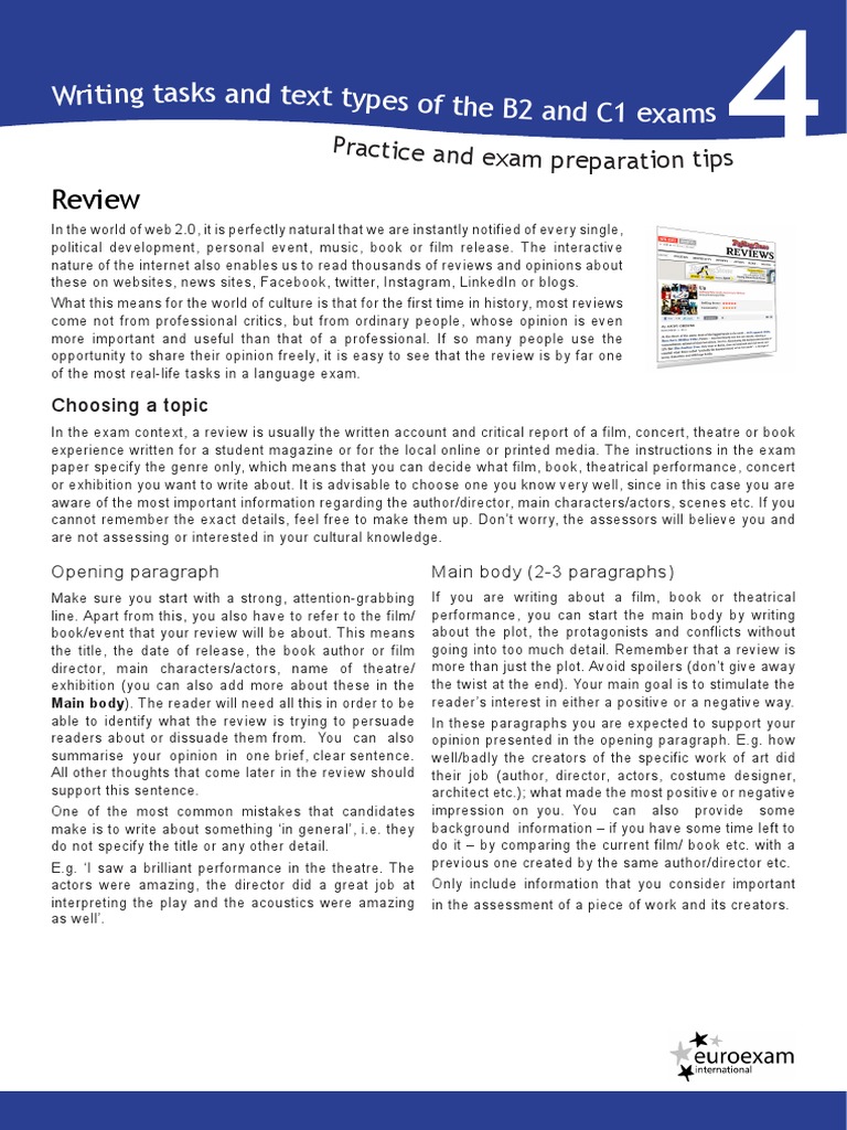 In the exam context, a review is usually the written account and critical report of a film, concert, theatre or book