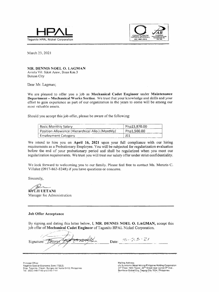 By signing auid dating this letter below, I, MR. IIENNIS NOEL O. LAGMAN, accept this