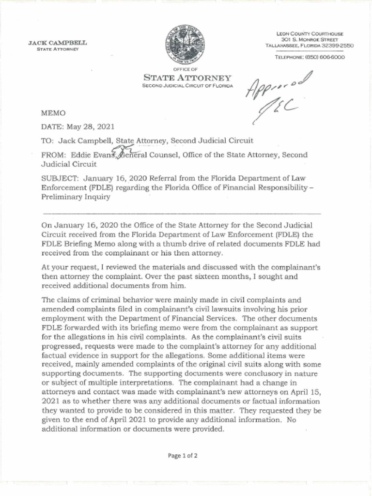 Memo to Jack Campbell from the Office of the State Attorney for Florida's 2nd Judicial Circuit.