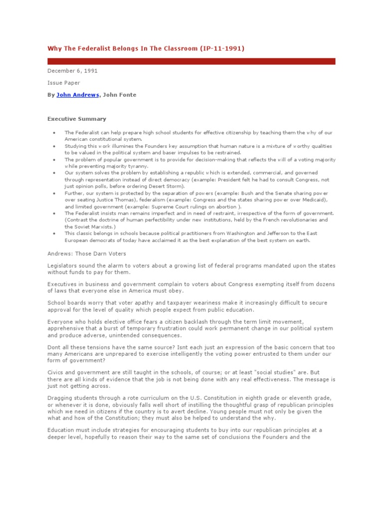 • The Federalist can help prepare high school students for effective citizenship by teaching them the why of our