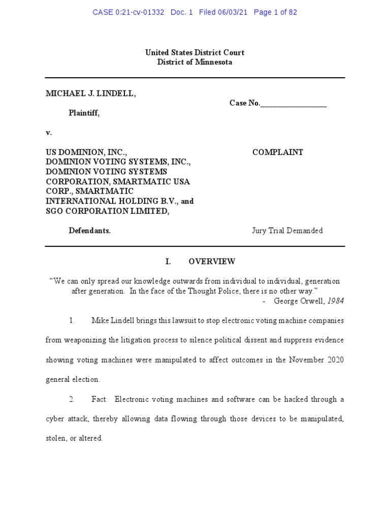 United States District Court District of Minnesota MICHAEL J. LINDELL, Case No.________________ Plaintiff, v. US DOMINION, INC., COMPLAINT DOMINION VOTING SYSTEMS, INC., DOMINION VOTING SYSTEMS CORPORATION, SMARTMATIC USA CORP., SMARTMATIC INTERNATIONAL HOLDING B.V., and SGO CORPORATION LIMITED, Defendants.