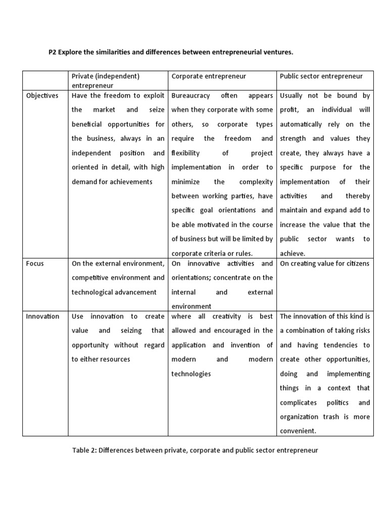 Table 2: Differences between private, corporate and public sector entrepreneur