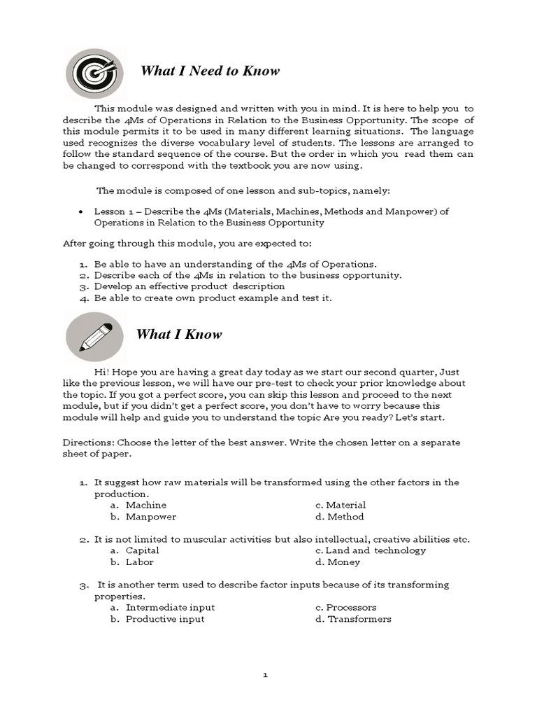 This document discusses a module that aims to help students understand the 4Ms of Operations in relation to a business opportunity. The 4Ms stand for Materials, Machines, Methods, and Manpower. The module contains one lesson that describes each of the 4Ms and how they relate to production. After completing the module, students should be able to describe the 4Ms, relate them to a business opportunity, develop an effective product description, and create their own product example.