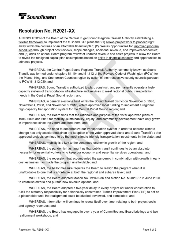 A RESOLUTION of the Board of the Central Puget Sound Regional Transit Authority establishing a flexible framework to implement the ST2 and ST3 plans that (1) allows project work to proceed right away within the confines of an affordable financial plan; (2) creates opportunities for improved program schedules through project cost reviews, scope changes, additional revenue, and improved economics; and (3) adds an annual Board program review of updated revenue and costs projects to allow the Board to revisit the realigned capital plan assumptions based on shifts in financial capacity and opportunities to advance projects. WHEREAS, the Central Puget Sound Regional Transit Authority, commonly known as Sound Transit, was formed under chapters 81.104 and 81.112 of the Revised Code of Washington (RCW) for the Pierce, King, and Snohomish Counties region by action of their respective county councils pursuant to RCW 81.112.030; and WHEREAS, Sound Transit is authorized to plan, construct, and permanently operate a high-capacity system of transportation infrastructure and services to meet regional public transportation needs in the Central Puget Sound region; and WHEREAS, in general elections held within the Sound Transit district on November 5, 1996, November 4, 2008, and November 8, 2016, voters approved local funding to implement a regional high-capacity transportation system for the Central Puget Sound region; and WHEREAS, the Board finds that the rationale and purpose of the voter approved plans of 1996, 2008 and 2016 for mobility, sustainability, equity, and community development have only grown in importance since the voters adopted them; and WHEREAS, the need to decarbonize our transportation system in order to address climate change has only accelerated since the adoption of the voter approved plans and S