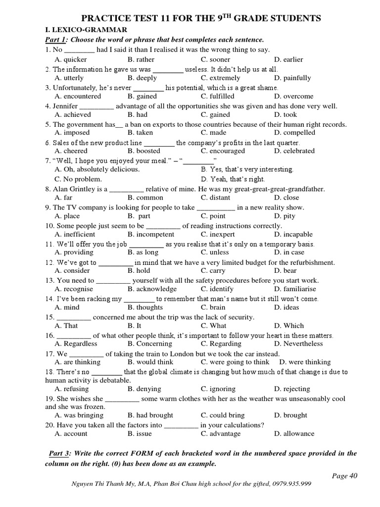 PRACTICE TEST 11 FOR THE 9TH GRADE STUDENTS