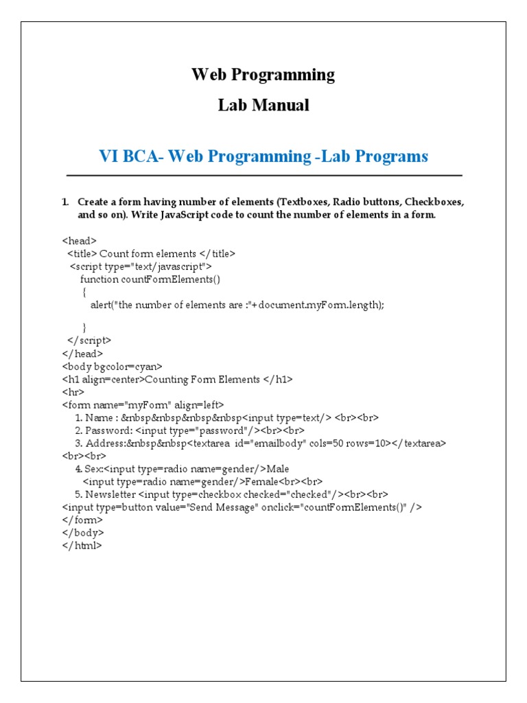 1. Create a form having number of elements (Textboxes, Radio buttons, Checkboxes,