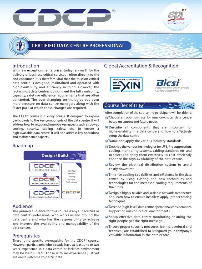the official ‘Certified Data Centre Professional’ certificate. their staff working in and around the data centre and use