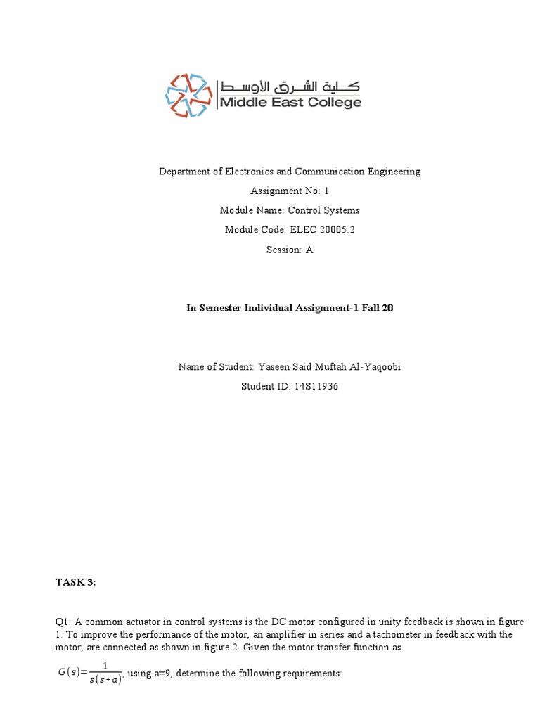 a. If this motor were connected in a unity feedback system as shown in figure 1, calculate the percent