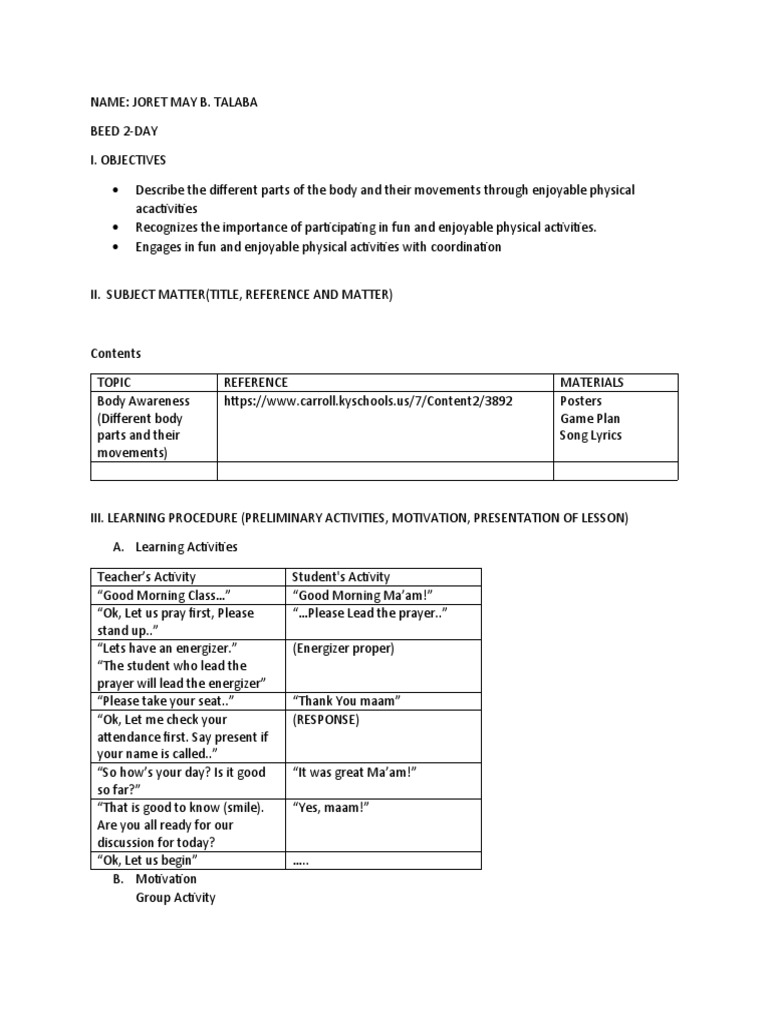 III. LEARNING PROCEDURE (PRELIMINARY ACTIVITIES, MOTIVATION, PRESENTATION OF LESSON)