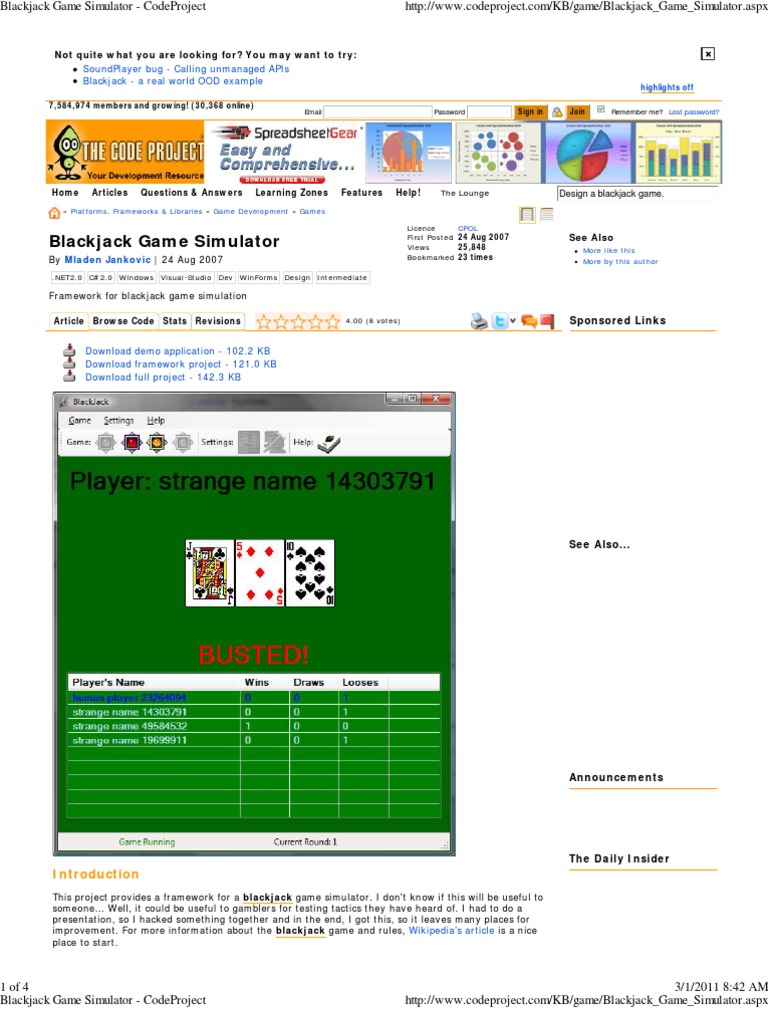 Blackjack Game Simulator - CodeProject http://www.codeproject.com/KB/game/Blackjack_Game_Simulator.