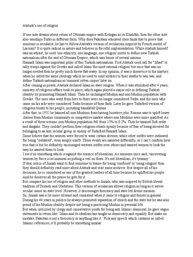 secularism to suit their needs. On other hand Jinnah definitely didn’t use religion as much as Ataturk