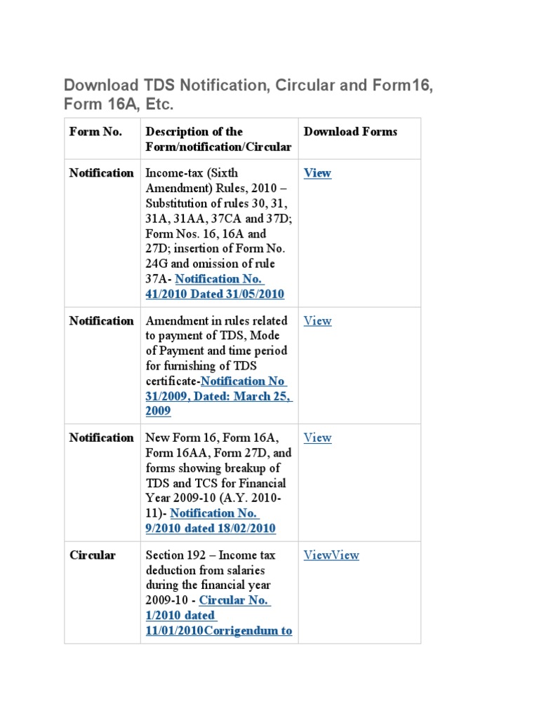 TDS Notification, Circular and Form16, Form 16A, Etc
