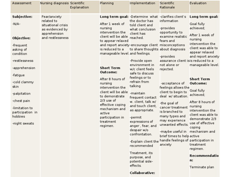 Subjective: Fear/anxiety Long term goal: -Determine what -clarifies client’s Long term goal: