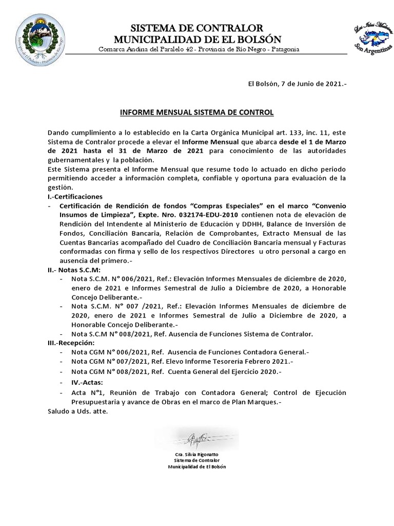 Sistema de Contralor procede a elevar el Informe Mensual que abarca desde el 1 de Marzo