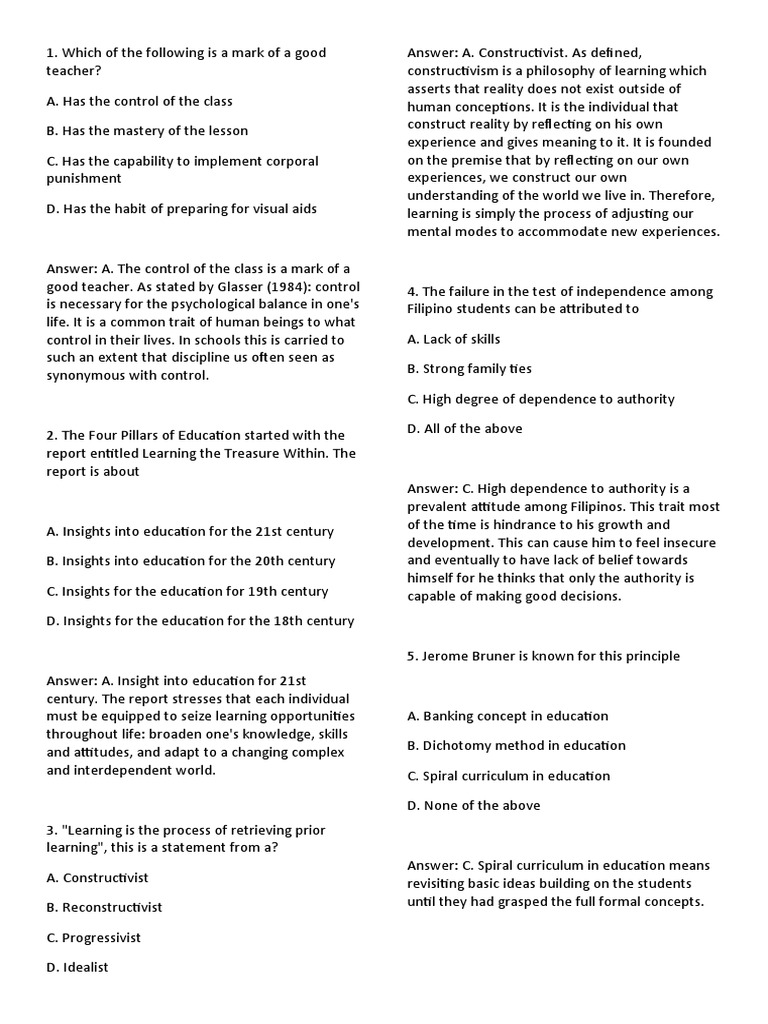 1. Which of the following is a mark of a good Answer: A. Constructivist.