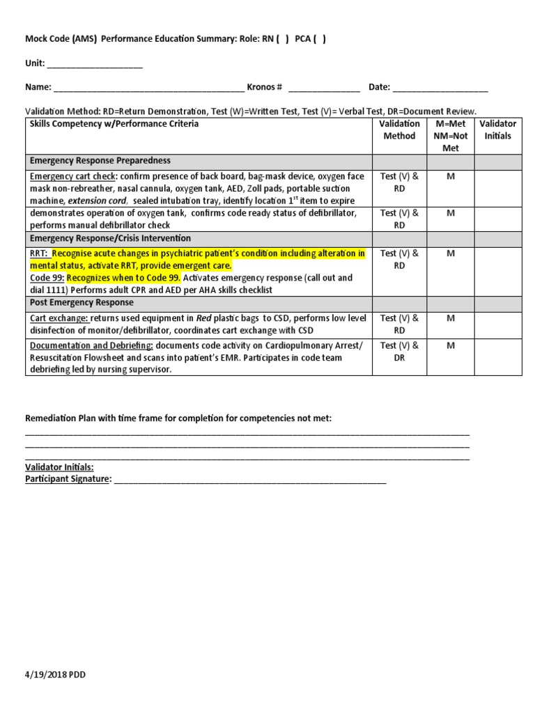 Mock Code (AMS) Performance Education Summary: Role: RN ( ) PCA ( )