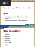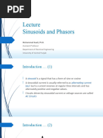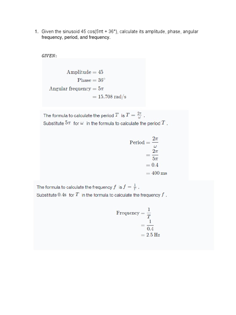 This document asks to calculate the amplitude, phase, angular frequency, period, and frequency for the sinusoid 45 cos(5πt + 36°). The amplitude is 45, the phase is 36°, the angular frequency is 5π, the period is 2π/5π = 1/5, and the frequency is 5π/2π = 5 cycles per unit time.
