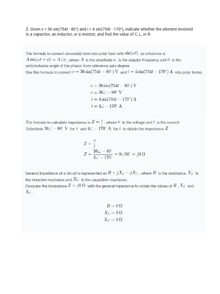 Given V 36 Sin (754t - 80°) and I 4 Sin (754t - 170°), Indicate Whether The Element Involved Is A Capacitor, An Inductor, or A Resistor, and Find The Value of C, L, or R