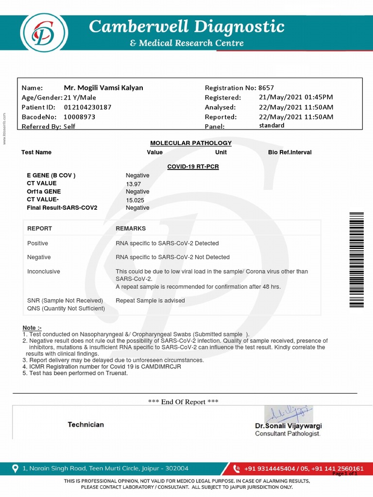 inhibitors, mutations & insufficient RNA specific to SARS-CoV-2 can influence the test result. Kindly correlate the