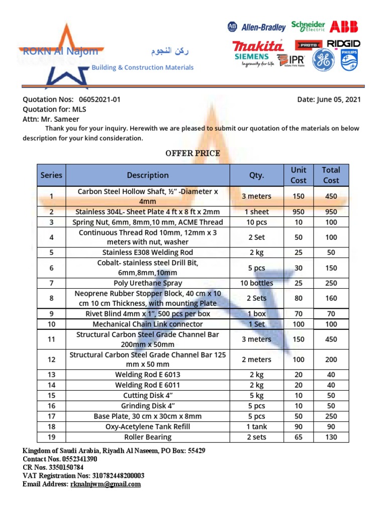 Thank you for your inquiry. Herewith we are pleased to submit our quotation of the materials on below