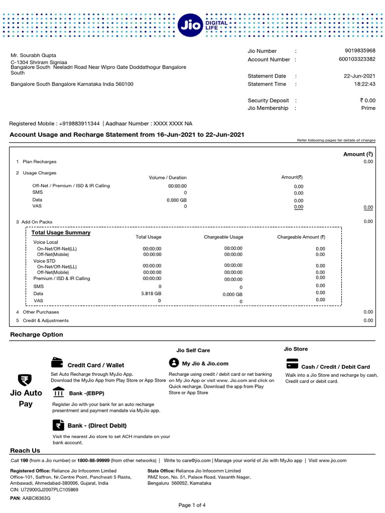 Mr. Sourabh Gupta Jio Number : 9019835968 Statement Date : 22-Jun-2021