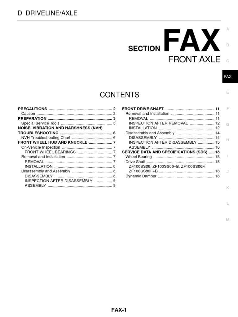 PRECAUTIONS .......................................................... 2 FRONT DRIVE SHAFT ............................................. 11 F