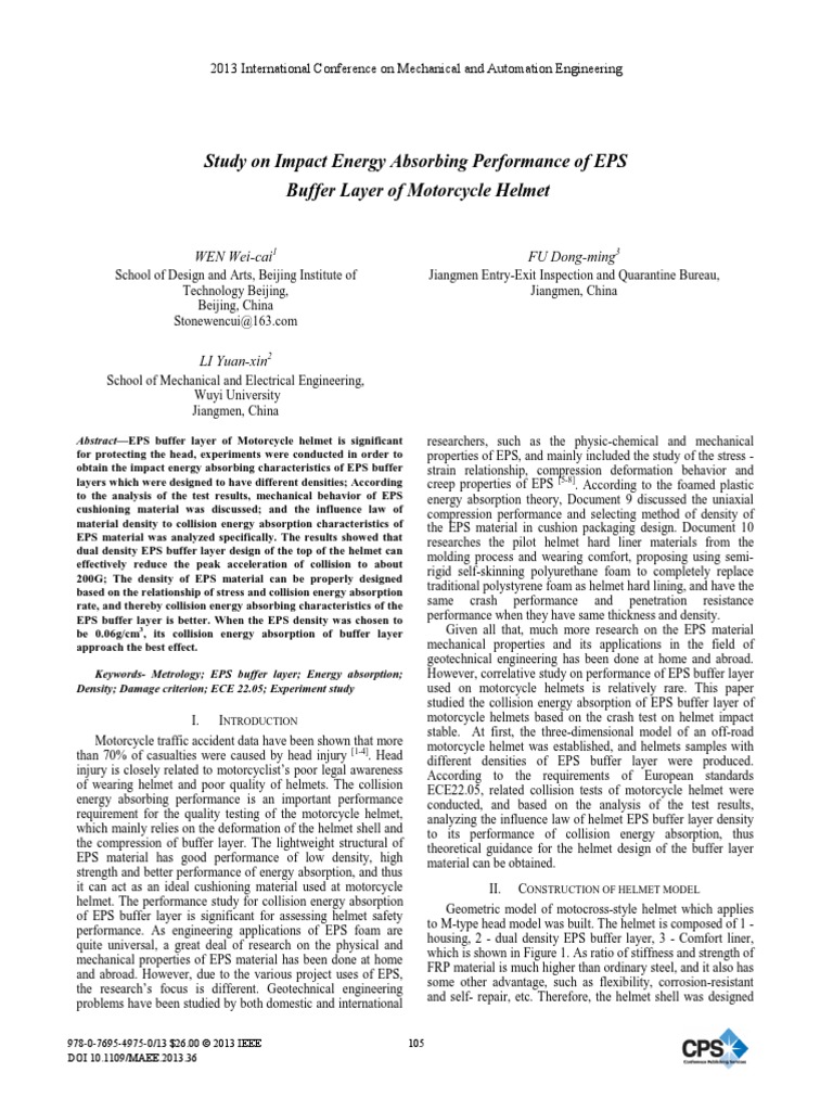 Abstract—EPS buffer layer of Motorcycle helmet is significant researchers, such as the physic-chemical and mechanical