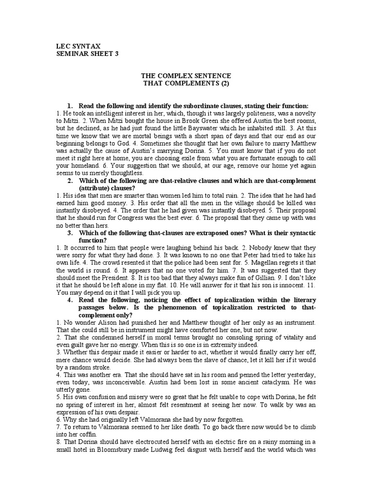 1. Read the following and identify the subordinate clauses, stating their function: