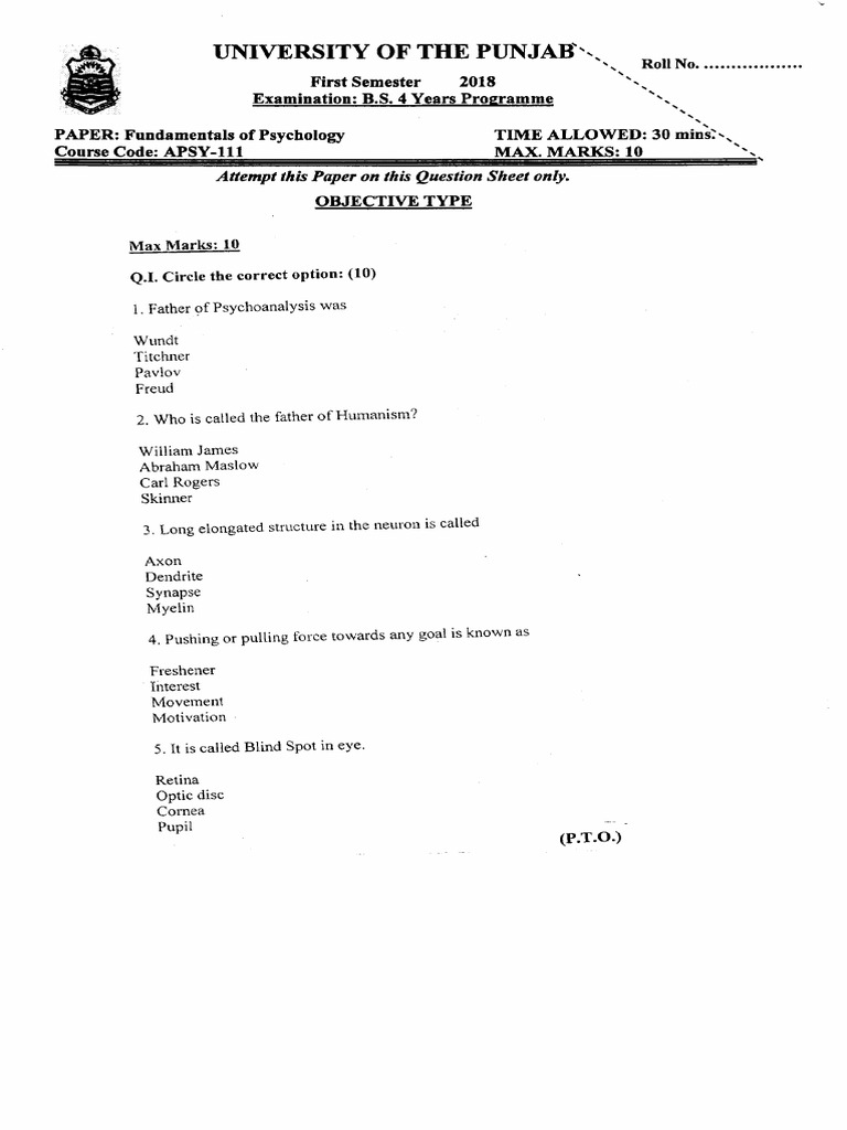 Punjab University Psychology Exam 2018
