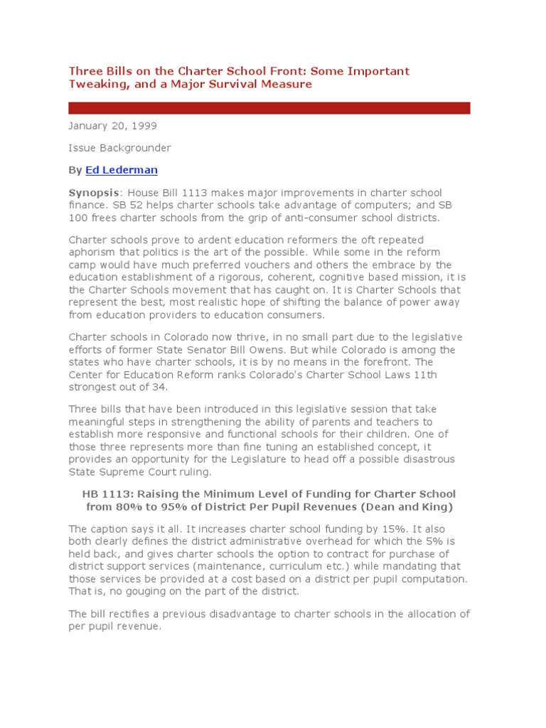 Three Bills On The Charter School Front - Some Important Tweaking, and A Major Survival Measure