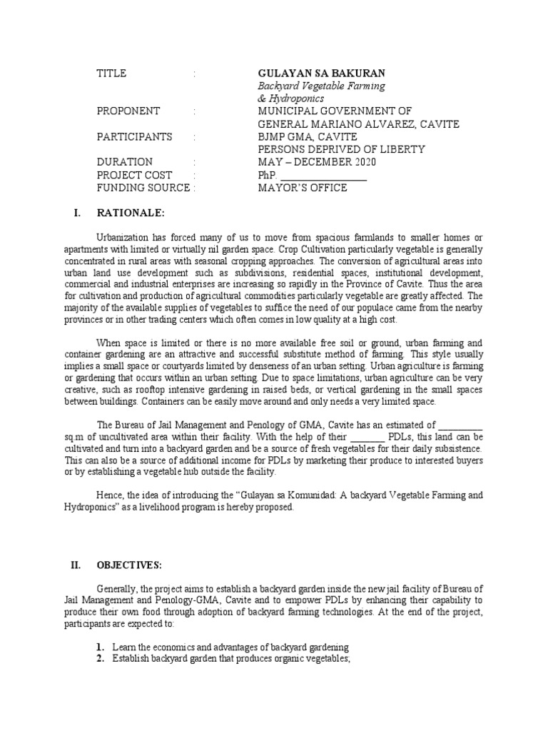 Generally, the project aims to establish a backyard garden inside the new jail facility of Bureau of