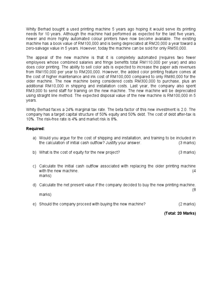 Whity Berhad faces a 24% marginal tax rate. The beta factor of this new investment is 2.0. The
