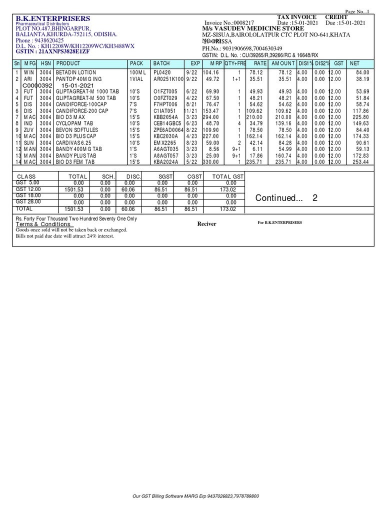Pharmaceutical Distributors Invoice No.:0008217 Date :15-01-2021 Due :15-01-2021