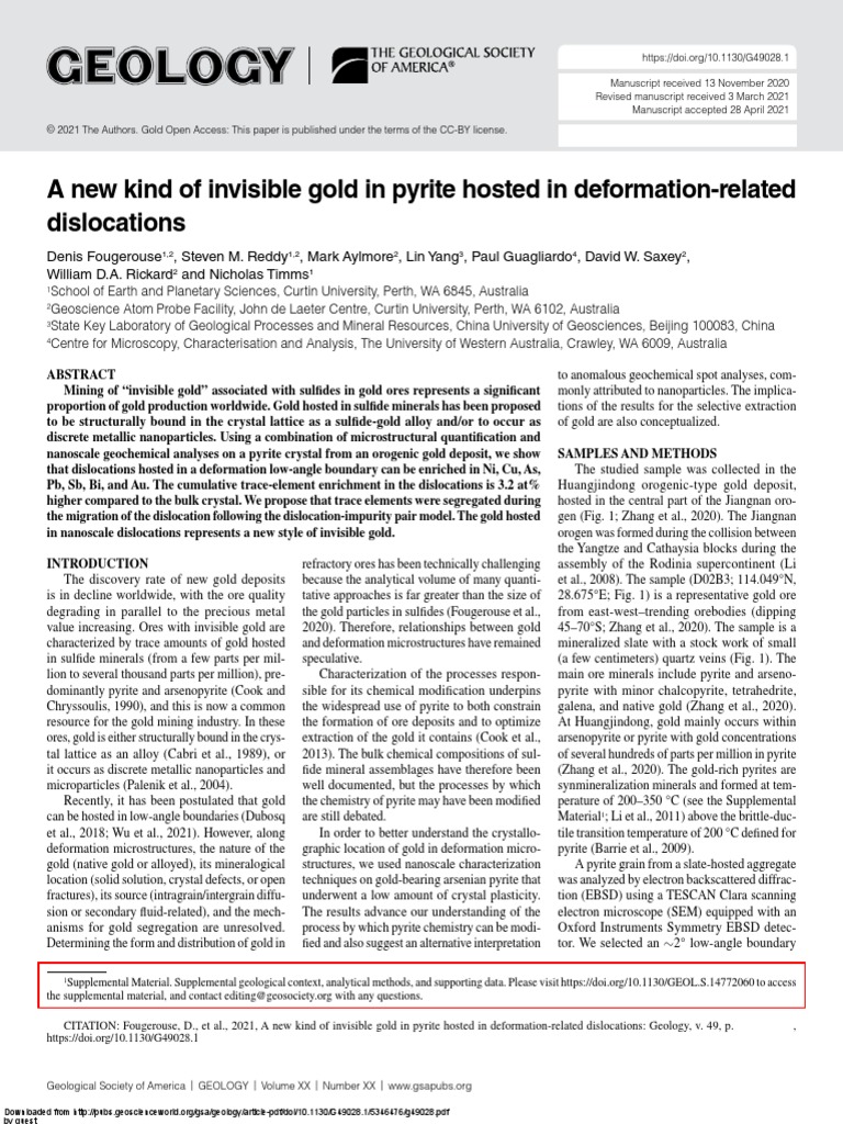 CITATION: Fougerouse, D., et al., 2021, A new kind of invisible gold in pyrite hosted in deformation-related dislocations: Geology, v. 49, p. XXX–XXX,